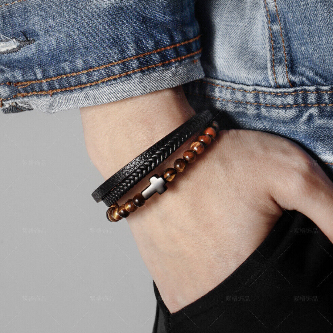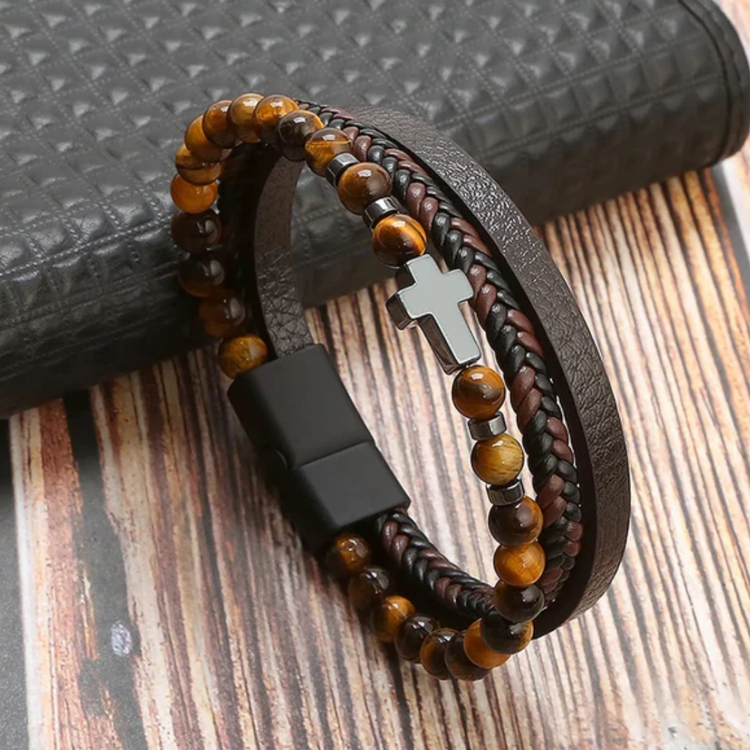 Pulseira de couro do Guardião Espiritual: Olho de Tigre, cruz, couro entrançado e círculo magnético.